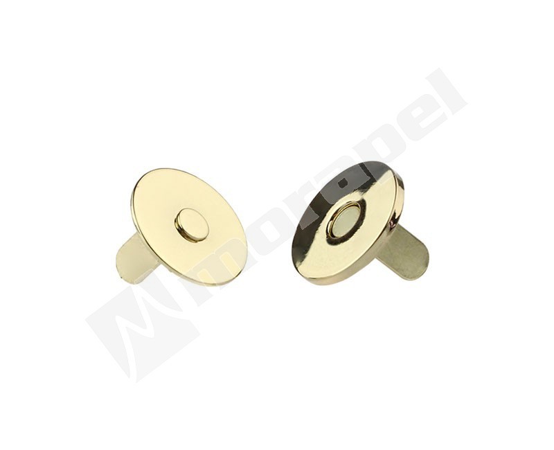 Okrągłe, neodymowe, płaskie zapięcie magnetyczne o średnicy 18 mm, z mocowaniem "na wąsy", powłoka: złoty. Zatrzaski na magnes to popularne zapięcia stosowane w torebkach, plecakach, kosmetyczkach, jak również w różnych typach odzieży.